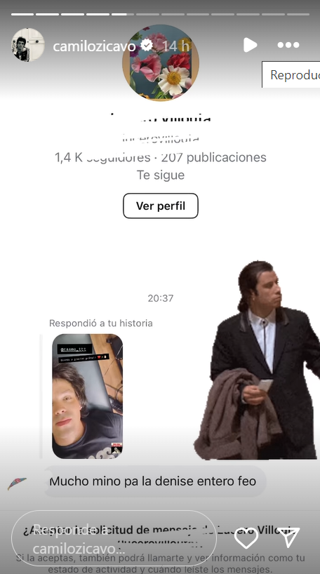 "Mucho mino pa la Denise, entero feo", escribió la persona. Ante esto, Zicavo respondió con el clásico meme de John Travolta en la película Pulp Fiction, donde el actor aparece confundido y mirando para ambos lados.