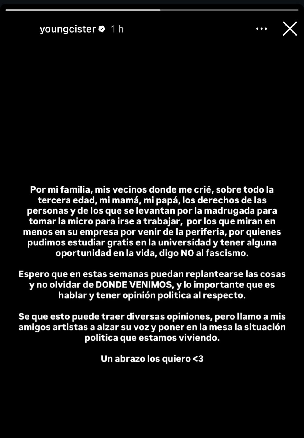 Asimismo, la artista escribió "jamás con el fascismo" y también emplazó a otros exponentes del género urbano. "Tienen miles de seguidores, la mayoría son jóvenes. Ocupen su plataforma, ¿o les da miedo un unfollow?", arremetió.