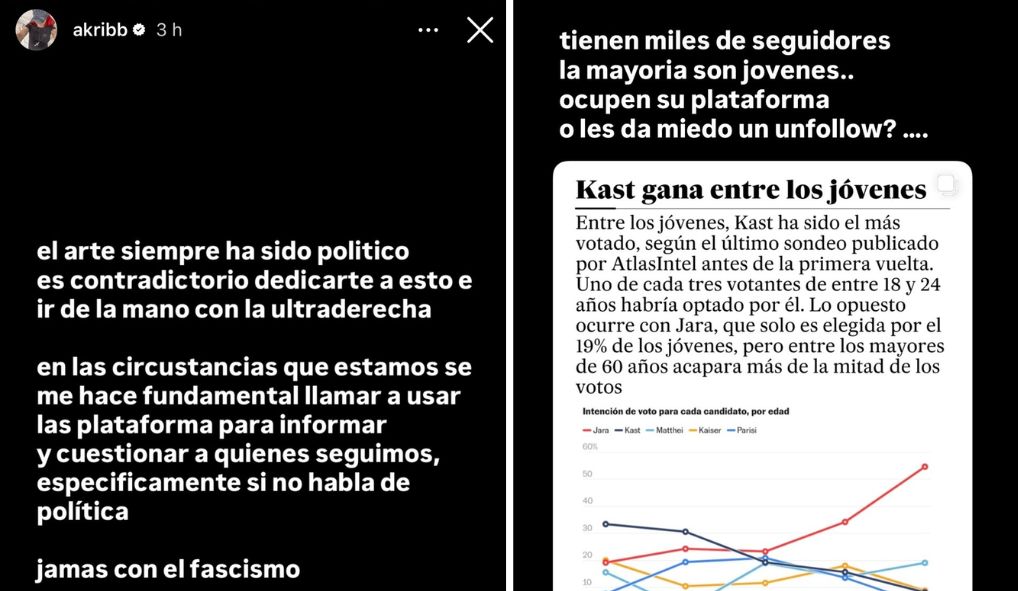 La destacada cantante Fernanda Sepúlveda, conocida como AKRIILA, expresó que "el arte siempre ha sido político, es contradictorio dedicarte a esto e ir de la mano de la ultraderecha".