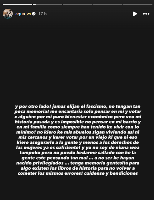 "Por mi familia, mis vecinos donde me crié, sobre todo la tercera edad, mi mamá, mi papá, los derechos de las personas y de los que se levantan por la madrugada para tomar la micro para irse a trabajar, por los que miran en menos en su empresa por venir de la periferia, por quienes pudimos estudiar gratis en la universidad y tener alguna oportunidad en la vida, digo NO al fascismo", partió diciendo.
