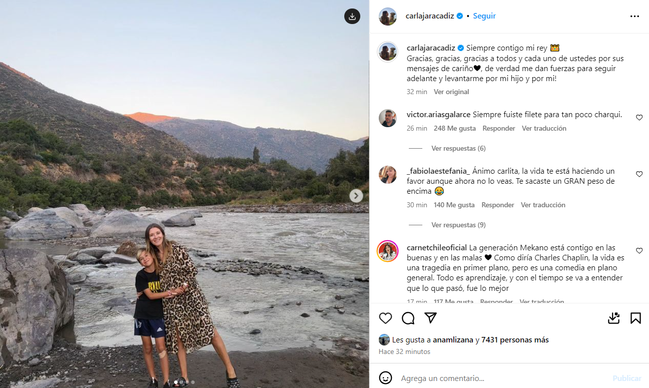 "Siempre contigo mi rey", partió diciendo la actriz en la descripción de su último post, y en menos de una hora, superó los 300 comentarios, entre amigas, familiares y seguidoras de su trabajo. En esta misma línea, mostró su gratitud por todos los que le han hablado en la última semana, ya sea para aconsejarla, prestarle un hombro para llorar o recordarle la valiosa mujer que es. "Gracias, gracias, gracias a todos y cada uno por sus mensajes de amor, de verdad que me dan fuerza para seguir a delante y levantarme por mi hijo y por mí", cerró la publicación. Ante estas emotivas palabras, Jara recibió nuevos mensajes de apoyo y felicitaciones por seguir adelante. "Los hijos siempre nos salvan" y "Nunca lo olvides, eres hermosa, buena mujer, tremenda mamá", fueron algunos de los comentarios que le dejaron en redes sociales.