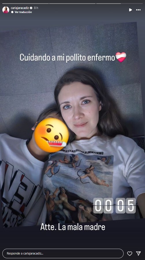 En la publicación se ve a Jara en cama junto a su hijo, a quien le tapó la cara, y escribió: "Cuidando a mi pollito enfermo. Atte., la mala madre".