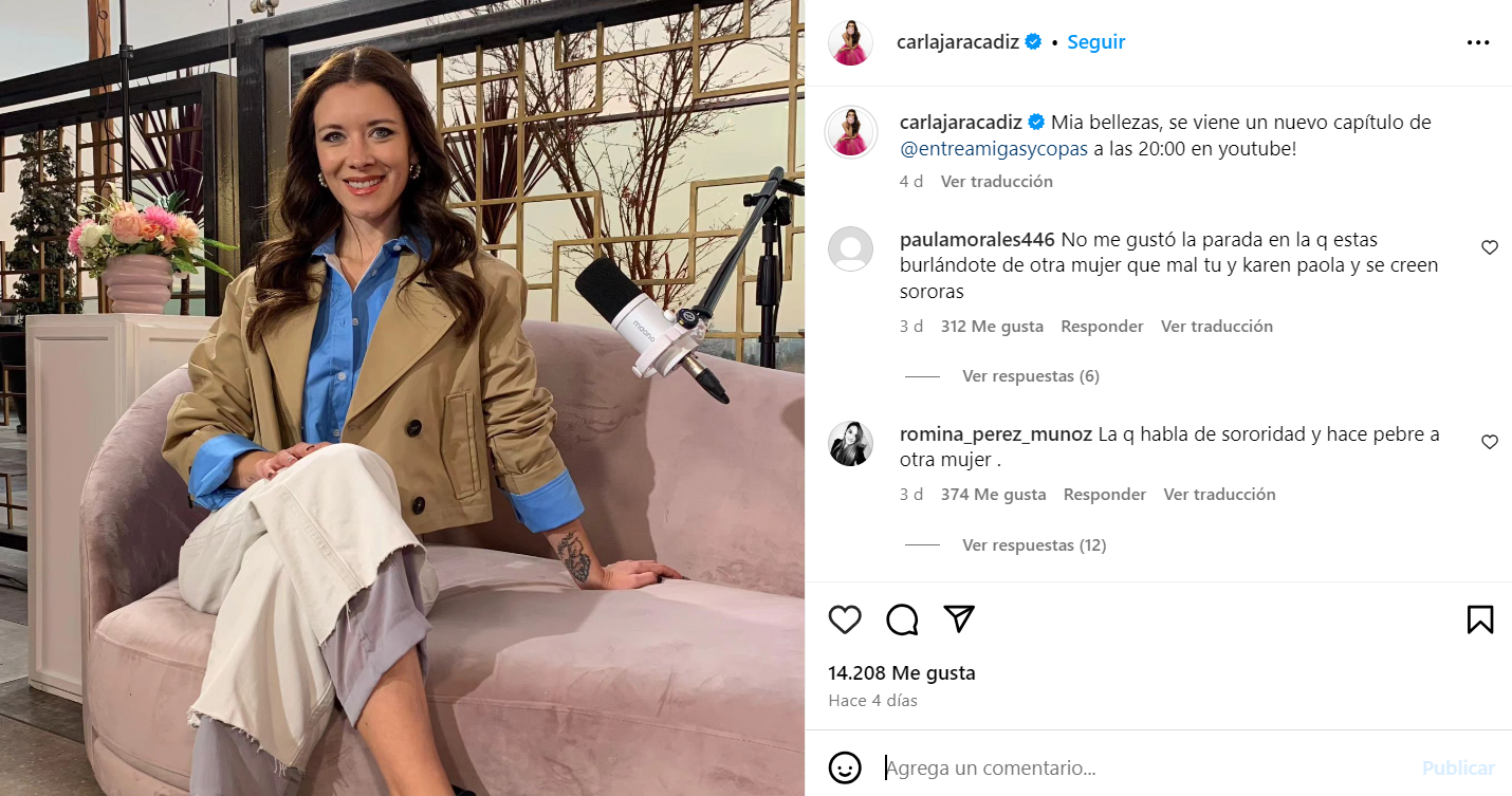 Aunque no revelaron el nombre de la persona, los internautas repudiaron el modo en que se refirieron a otras mujeres y llenaron la publicación en la cuenta de Instagram de Carla Jara con mensajes al respecto.