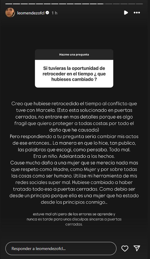 “Creo que hubiese retrocedido el tiempo al conflicto que tuve con Marcela. (Esto está solucionado en puertas cerradas, no entraré en más detalles porque es algo frágil que quiero proteger a todas costas por todo el daño que he causado)”, explicó.