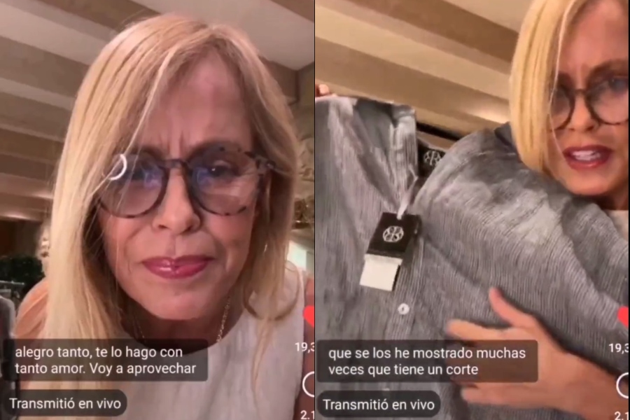 Luego, sosteniendo un vestido rayado con una etiqueta que indicaba su tamaño, dijo: "Tengo en los tres colores. Para todas las gorditas preciosas de mi corazón. Para que no me vuelvan a decir tonteras de que yo no las quiero. Este vestido yo se los he mostrado muchas veces que tiene un corte maravilloso acá, para que no sea como una carpa que te cae así".