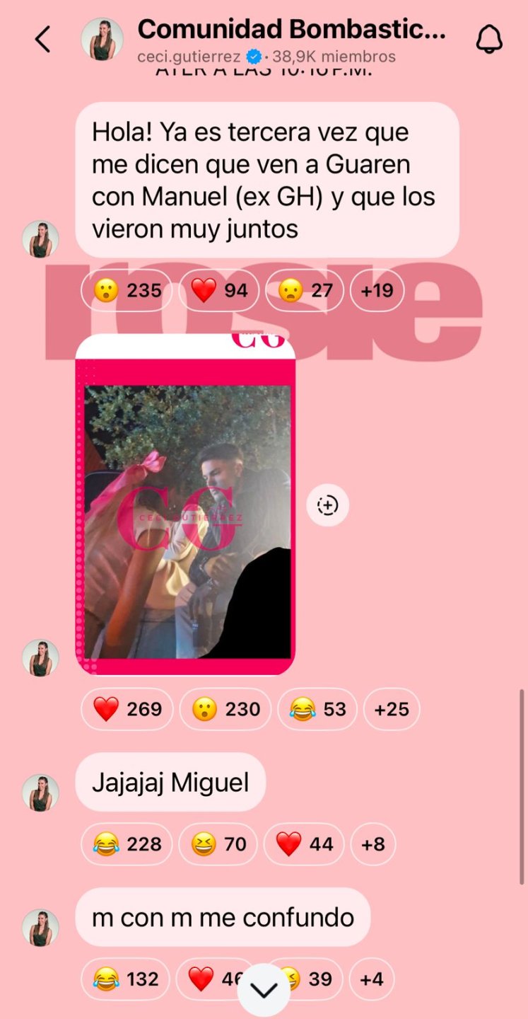 A través de su canal de difusión en su cuenta de Instagram, Gutiérrez aseguró: "Ya es tercera vez que me dicen que ven a Guarén con Miguel (ex GH) y que los vieron muy juntos".