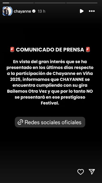 A través de sus historias de Instagram, el equipo de comunicaciones de Chayanne partió diciendo: "En vista del gran interés que se ha presentado en los últimos días respecto a la participación de Chayanne en Viña 2025, informamos que Chayanne se encuentra cumpliendo con su gira Bailemos Otra Vez".