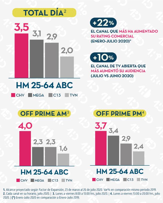 Estos resultados de Chilevisión se enmarcan en una tendencia al alza que muestra el canal durante todo el 2020. Comparado el periodo enero-julio de 2019 con el 2020, el canal aumentó en 22% su rating comercial, con lo que se posiciona como la señal que ha experimentado la mayor alza del periodo.