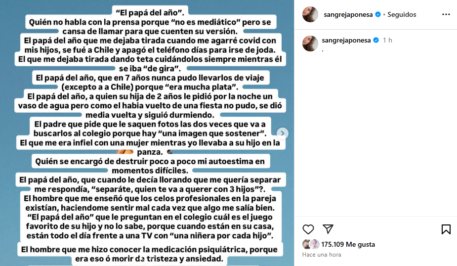 A través de Instagram, la actriz argentina compartió un extenso descargo titulado "El papá del año", donde hizo fuertes acusaciones en contra del chileno, luego que este le revocara el permiso para viajar con sus hijos a Turquía.