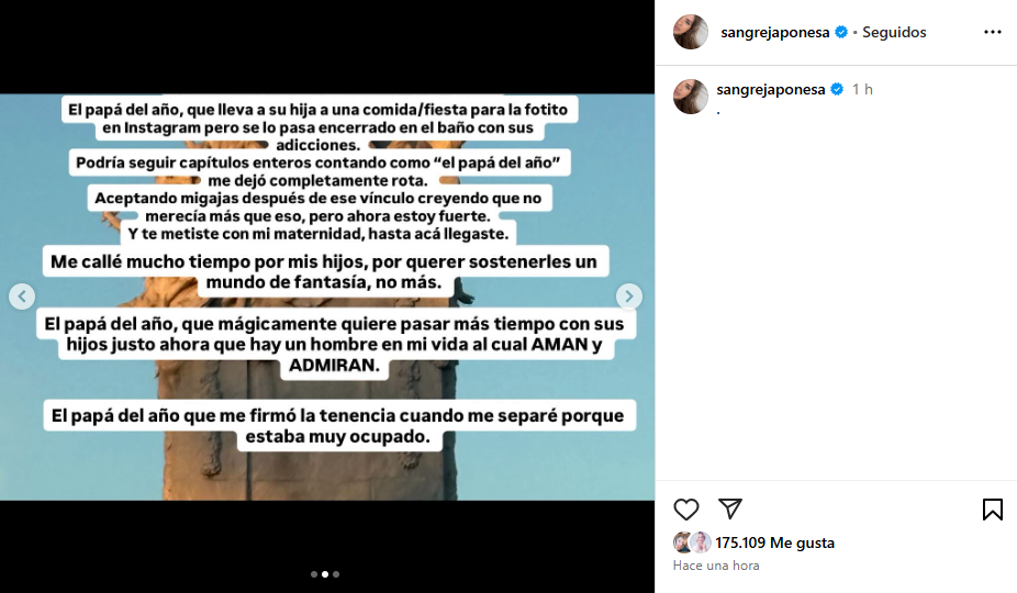 "El papá del año, que lleva a su hija a una comida/fiesta para la fotito en Instagram, pero se lo pasa encerrado en el baño con sus adicciones. Podría seguir capítulos enteros contando cómo 'el papá del año' me dejó completamente rota. Aceptando migajas después de ese vínculo, creyendo que no merecía más que eso, pero ahora estoy fuerte. Y te metiste con mi maternidad, hasta acá llegaste", apuntó.
