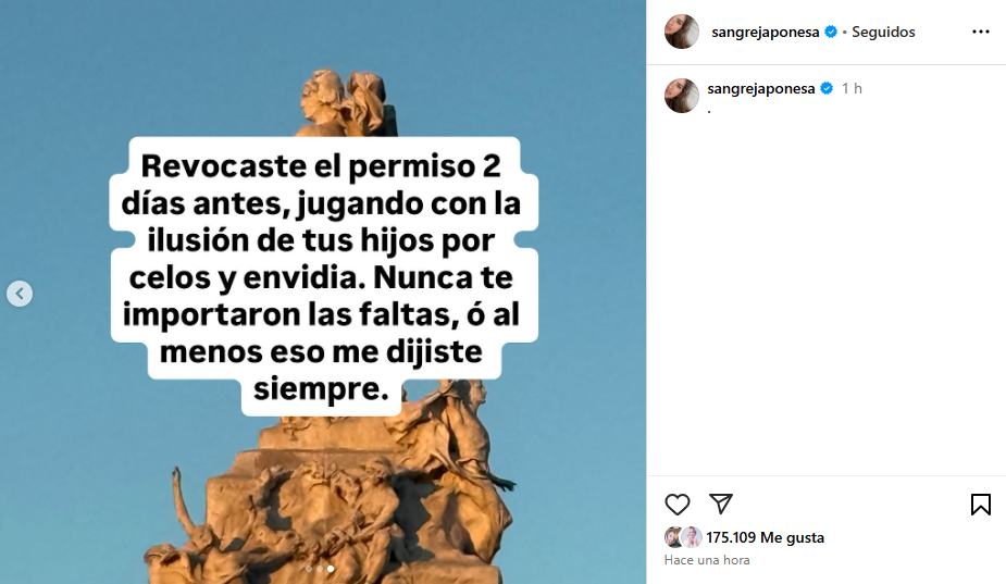 "Revocaste el permiso 2 días antes, jugando con la ilusión de tus hijos por celos y envidia. Nunca te importaron las faltas, o al menos eso me dijiste siempre", cerró la actriz, restringiendo la posibilidad de dejar comentarios en el posteo.