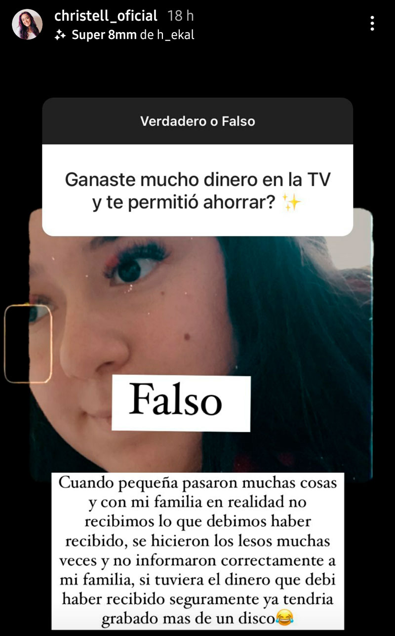 Con estos antecedentes, muchos se preguntan hasta hoy qué fue de las ganancias que obtuvo la artista en su niñez. La duda fue contestada por la propia Christell, quien en el juego de Instagram "Verdadero o Falso", respondió a la consulta "¿ganaste mucho dinero en la TV y te permitió ahorrar?".