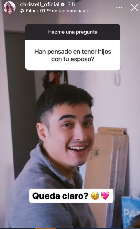 Interrogante que Christell respondió con un video de su esposo, Roberto Parra, con quien se casó en febrero del 2023 y hoy viven juntos: “Amor, oye, ¿tú quieres tener hijos?”, le preguntó Christell según consigno AR.