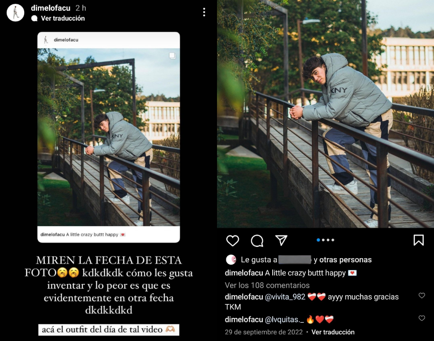 lo peor es que es evidentemente en otra fecha. Acá el outfit del día de tal video", escribió el artista en su cuenta de Instagram, mostrando una fotografía con el mismo conjunto de ropa que aparecía en la supuesta infidelidad, aunque la publicación