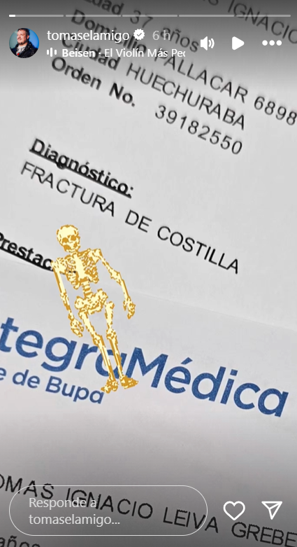 Fue el mismo Tomás Leiva, quien a través de historias de Instagram confirmó la lesión. Primero compartió el parte médico y luego señaló: "Demás está decirles que esto es un riesgo que yo asumí. Yasmani no tiene nada que ver, él fue a hacer lo que tiene que hacer, creo que lo hizo muy bien", explicó.