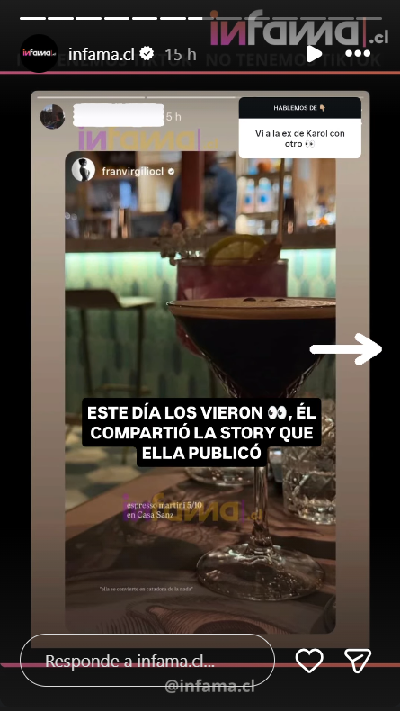 Al respecto, mostraron una historia de Instagram de la influencer, donde aparece en un bar bebiendo una copa de espresso martini, uno de sus cócteles favoritos y señalaron: "Este día los vieron, él compartió la story que ella publicó".