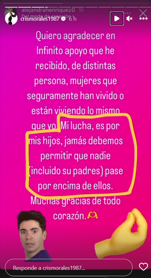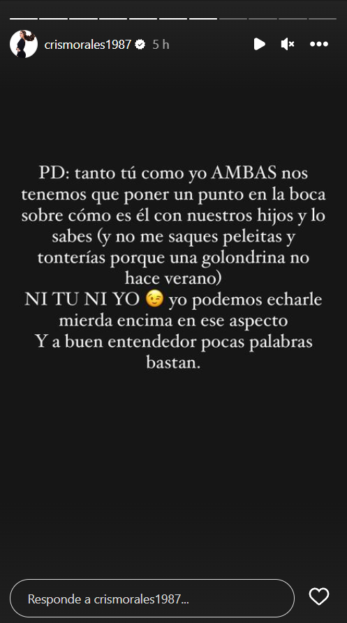 Ahora, nuevamente fue la actual pareja del bicampeón de América, Cristina Morales, la que respondió a las acusaciones de Henríquez. Recordemos que hace algunos días, la española señaló: "Por mi parte, aquí no van a ver jamás unas malas palabras hacia ella, pese a estar muy dolida con su nueva actitud hacia a mí". Sin embargo, este lunes lanzó duras palabras a la madre de los gemelos, luego de que ésta subiera una llamativa historia en la que escribió: “Mi lucha es por mis hijos. Jamás debemos permitir que nadie, incluido sus padres, pasen por encima de ellos”.