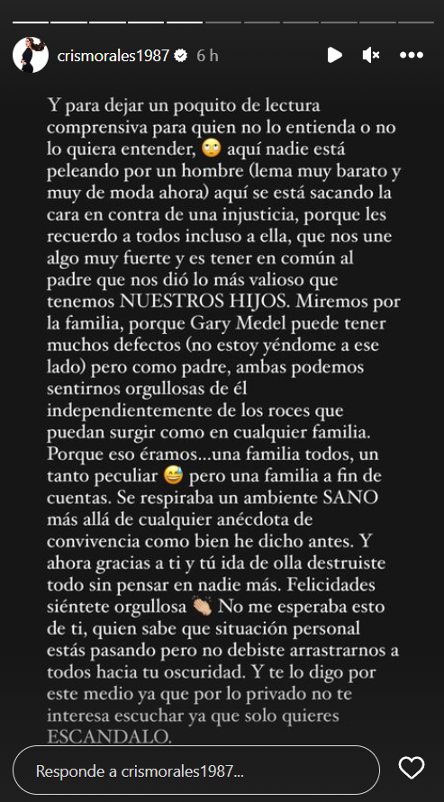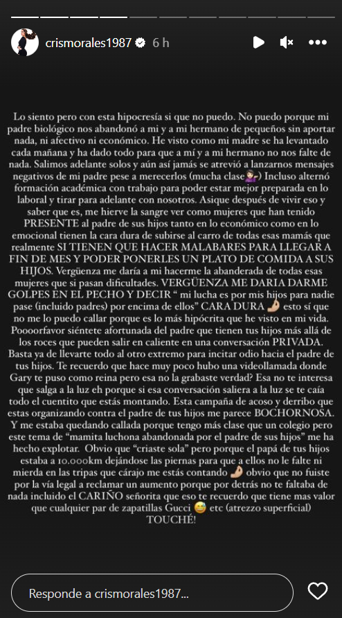 Tras ello, Morales arremetió y apuntó, otra vez por Instagram, que "con esta hipocresía no puedo. No puedo porque mi padre biológico nos abandonó a mí y a mi hermano de pequeños sin aportar nada, ni afectivo ni económico”. “Me hierve la sangre ver como mujeres que han tenido presente al padre de sus hijos, tanto en lo económico como en lo emocional, tienen la cara de subirse al carro de todas esas mamás que realmente sí tienen que hacer malabares para llegar a fin de mes y poder darles un plato de comida a sus hijos”, agregó. Pero la ibérica no se quedó ahí y trató a Alejandra de "caradura", insistiendo en que "esto sí que no me lo puedo callar porque es lo más hipócrita que he visto en mi vida. Hubo una videollamada donde Gary te puso como reina, pero esa no la grabaste. Esa no te interesa que salga a la luz porque se te caía todo el cuentito que estabas montando”.