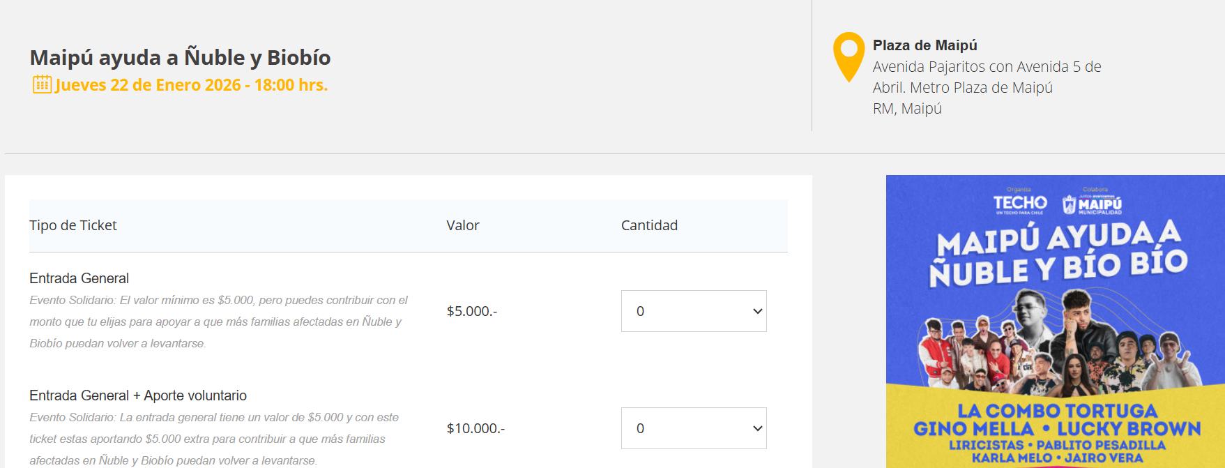 La cruzada se llevará a cabo este jueves 22 de enero a las 18:00 horas en la Plaza de Maipú y contará con las presentaciones de La Combo Tortuga, Pablito Pesadilla, Karla Melo, Lucky Brown, Liricistas y Gino Mella.