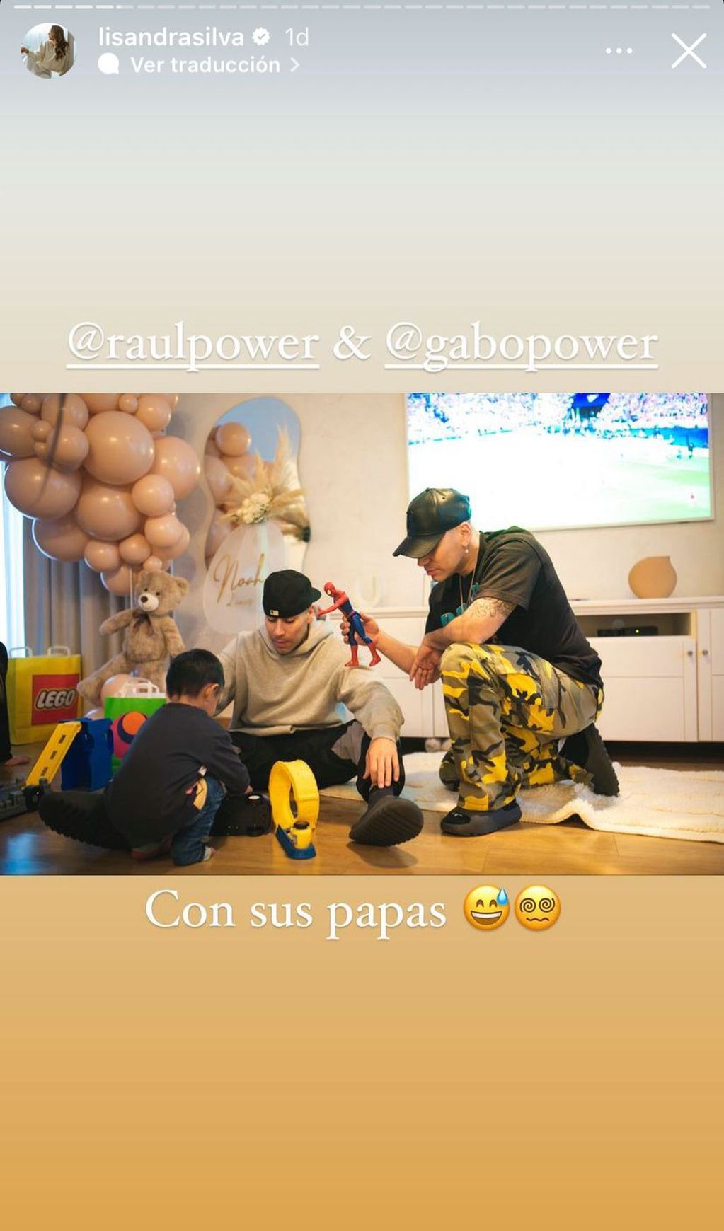 "Con mis papás", detalló en la foto que subió a sus stories. En ella, aparecen Noah jugando con Raúl y Gabriel Peralta en medio del festejo, dejando la duda sobre quién de los dos es el padre del niño.