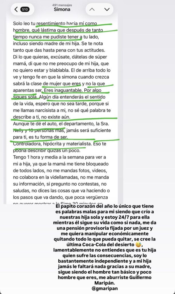 Asimismo, acusó: “Me quiere manipular económicamente quitando todo lo que pueda quitar (…) A mi hija jamás le faltará nada gracias a su madre, sigue siendo el hombre tan básico y poco hombre que eres. Me aburriste, Guillermo Maripán“.