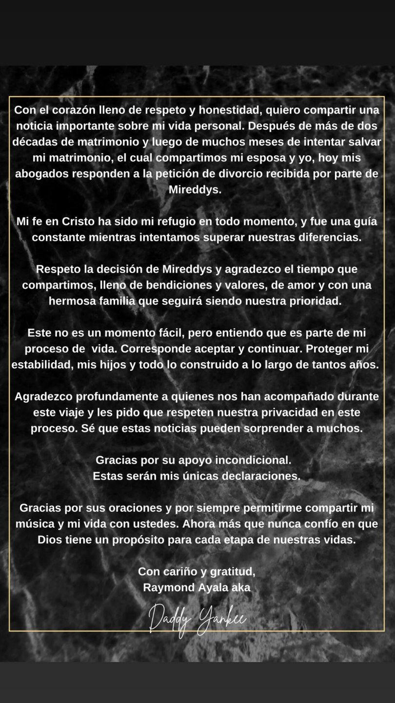 Aunque no entregó las razones del divorcio, Daddy Yankee publicó un comunicado en su cuenta de Instagram, donde señaló: "Con el corazón lleno de respeto y honestidad, quiero compartir una noticia importante sobre mi vida personal".