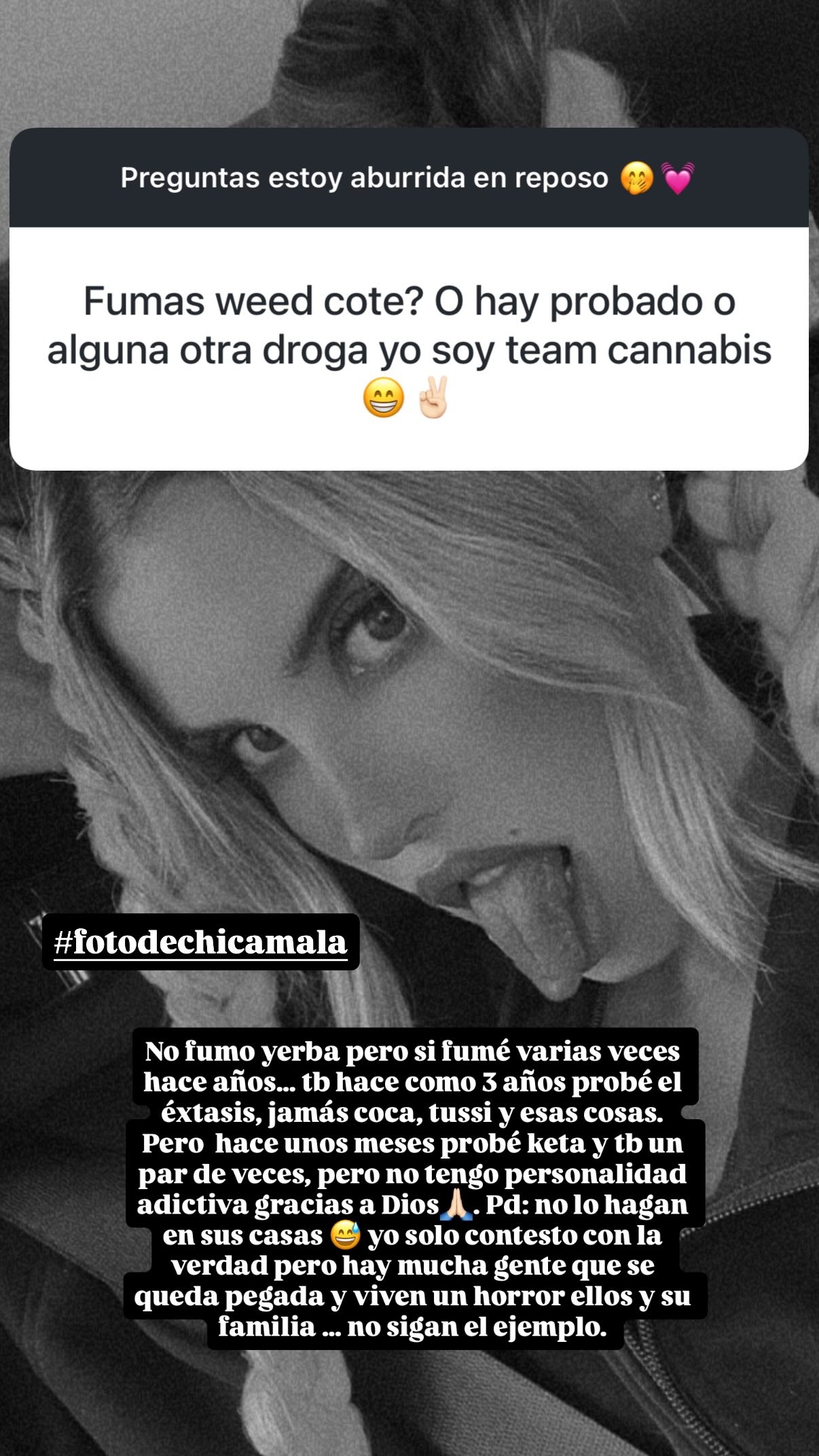 A través de una caja de preguntas en Instagram, un usuario le consultó a Coté si fumaba marihuana, a lo que esta contestó con el hashtag “fotodechicamala”.
