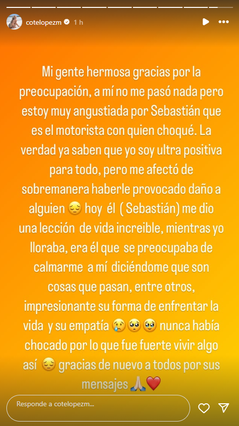 "Mi gente hermosa, gracias por la preocupación, a mí no me pasó nada, pero estoy angustiada por Sebastián, que es el motorista con quien choqué", partió señalando.