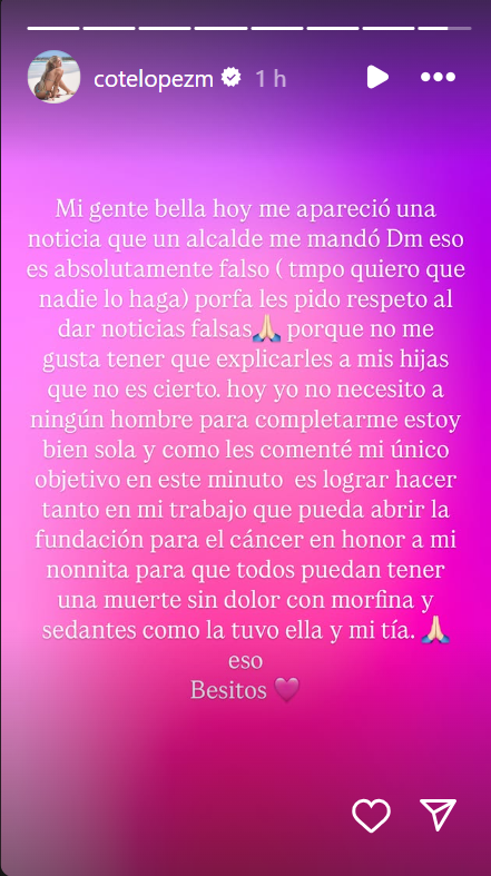“Mi gente bella, hoy me apareció una noticia que un alcalde me mandó DM. Eso es absolutamente falso, tampoco quiero que nadie lo haga”, escribió Coté López en sus historias de Instagram.