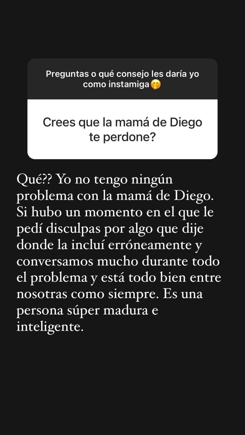 “Yo no tengo ningún problema con la mamá de Diego. Sí hubo un momento en el que le pedí disculpas por algo que dije donde la incluí erróneamente y conversamos mucho durante todo el problema y está todo bien entre nosotras como siempre”, detalló.