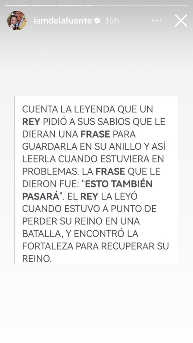 “Cuenta la leyenda que un Rey pidió a sus sabios que le dieran una frase para guardarla en su anillo y así leerla cuando estuviera en problemas. La frase que le dieron fue: ‘Esto también pasará’”, dice el texto que publicó en sus historias de la red social.
