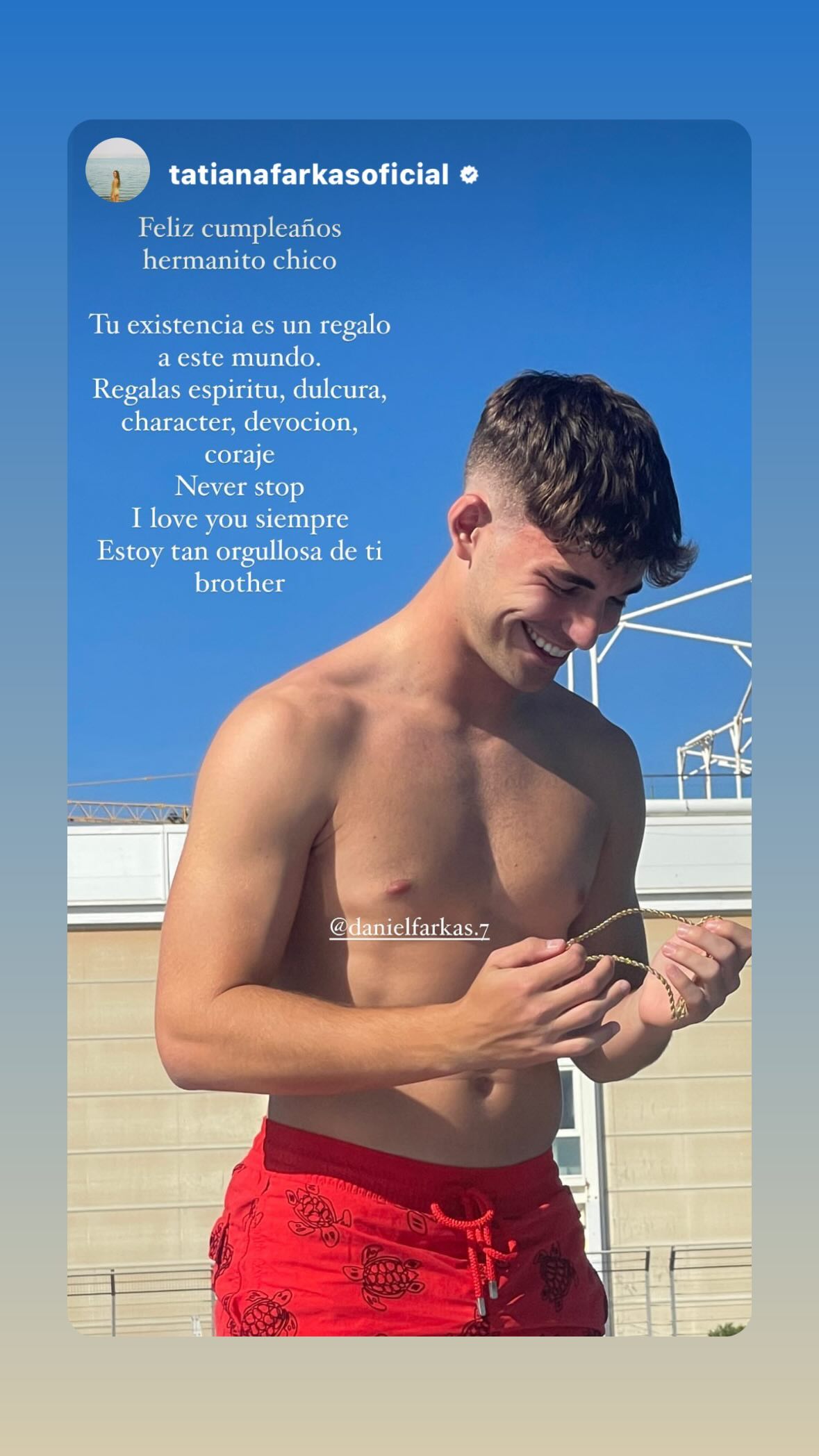 “Feliz cumpleaños hermanito chico. Tu existencia es un regalo a este mundo. Regalas espíritu, dulzura, carácter, devoción, coraje", escribió Tatiana. Finalmente, la joven concluyó con un mensaje de apoyo para su hermano: "Never stop, i love you siempre. Estoy orgullosa de ti brother @danielfarkas.7”.