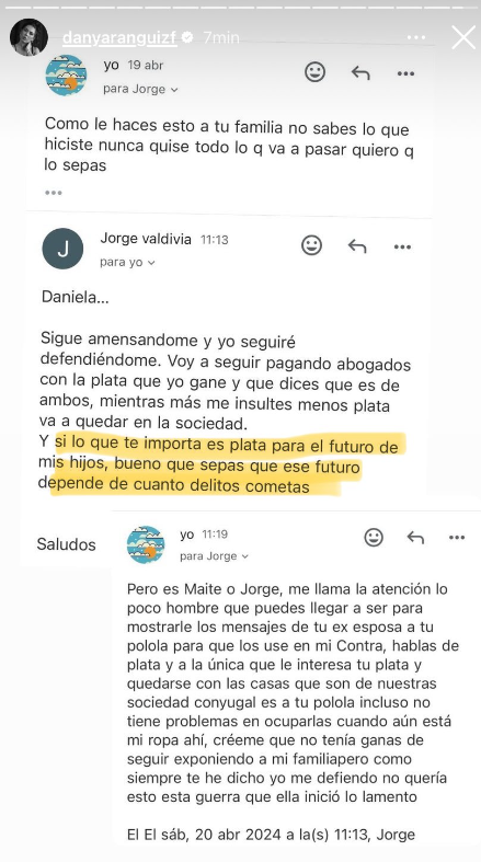 Por su parte, Daniela Aránguiz utilizó su cuenta de Instagram para publicar extractos de otros correos electrónicos en donde Jorge Valdivia la increpa y habla del dinero que existe dentro de una sociedad conyugal.