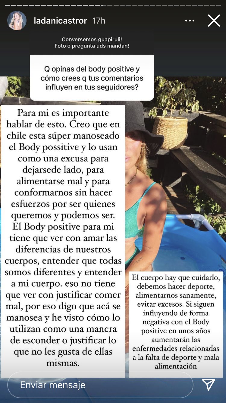 "Creo que en Chile está súper manoseado el body positive y lo usan como una excusa para dejarse de lado, para alimentarse mal y para conformarnos sin hacer esfuerzos por quienes queremos y podemos ser", respondió Castro en una historia de Instagram.