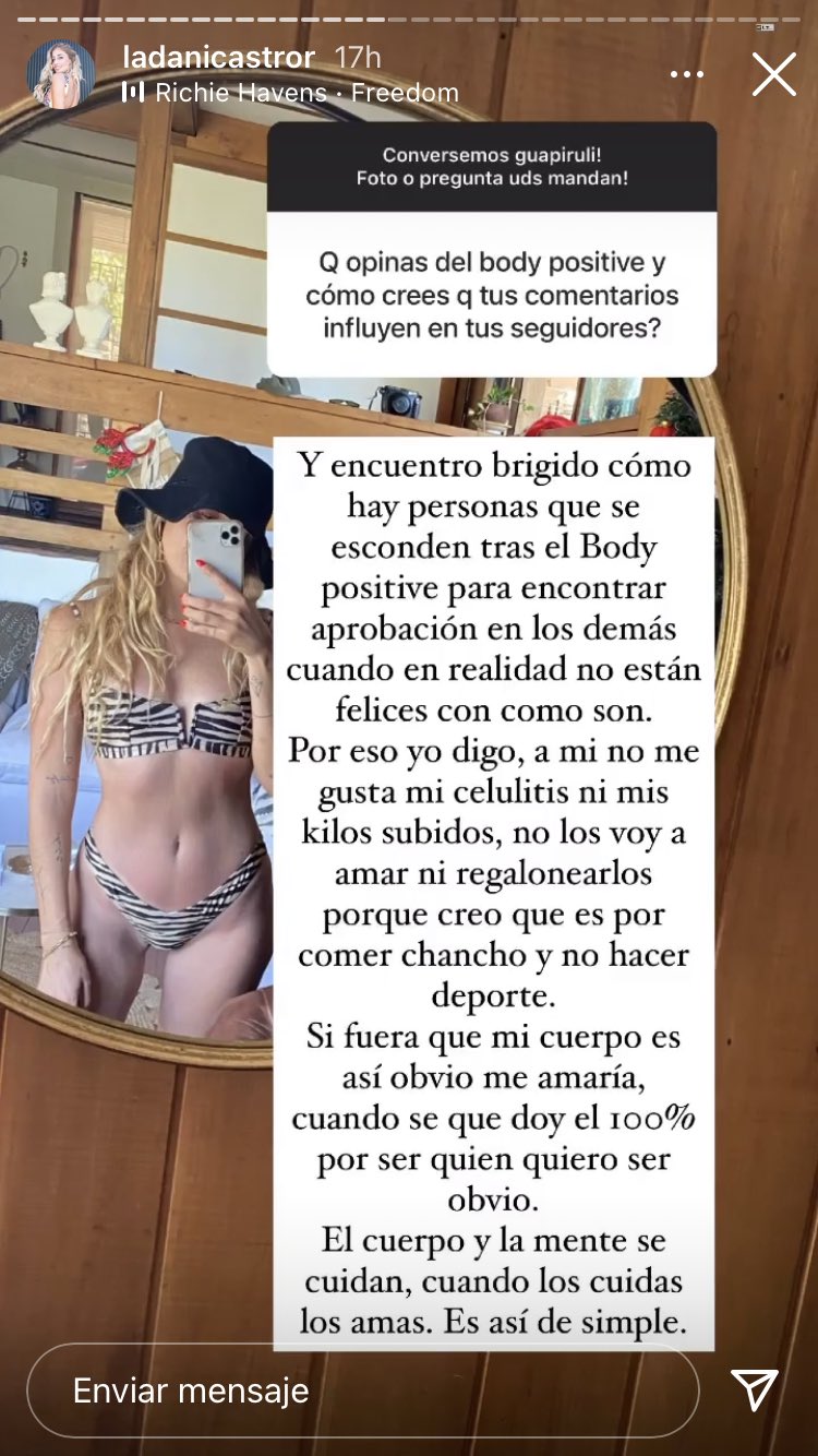 En un siguiente publicación, Castro señaló: "No me gusta mi celulitis ni mis kilos subidos, no los voy a amar ni regalonearlos porque creo que es por comer chancho y no hacer deporte".