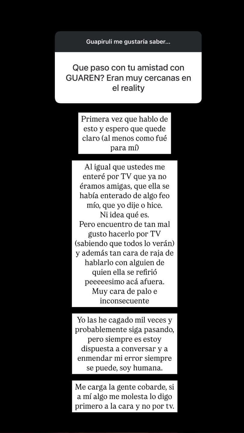 "¿Qué pasó con tu amistad con Guarén? Eran muy cercanas", le consultó un usuario a Castro en una caja de preguntas que colocó en sus historias de Instagram.