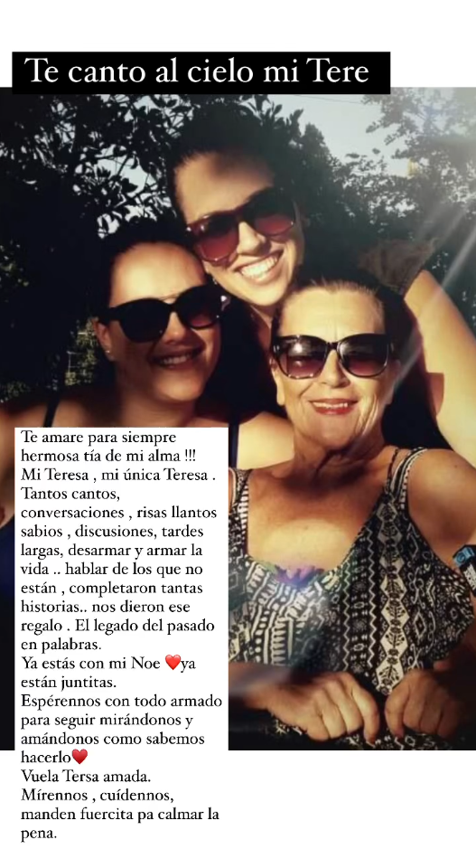 "Te amaré para siempre, hermosa tía de mi alma. Mi Teresa, mi única Teresa. Tantos cantos, conversaciones, risas, llantos, discusiones, tardes largas, desarmar y armar la vida. Hablar de los que no están, completaron tantas historias", agregó.