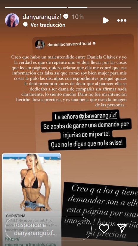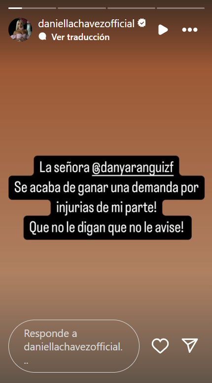 "La señora Daniela Aránguiz se acaba de ganar una demanda por injurias de mi parte. Que no le diga que no le avisé", escribió Daniella en una storie de Instagram.