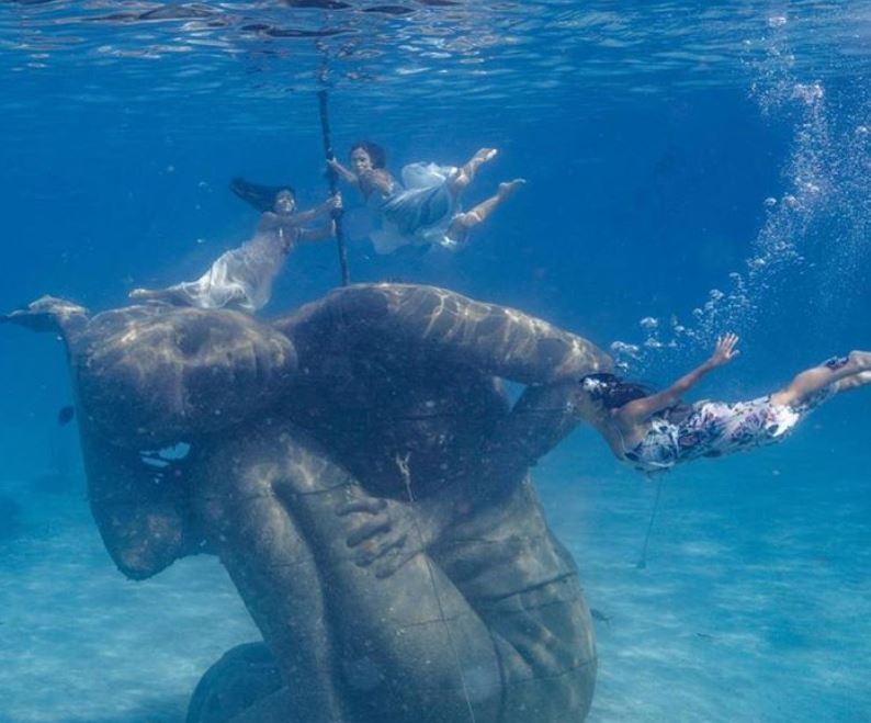 Desde comienzos de noviembre que han deleitado con fotografías de los paradisiacos paisajes en Bahamas, pero una de las que más llamó la atención, es donde aparecen bajo el agua posando con la famosa escultura Ocean Atlas, la cual mide 5.5 metro y es la más alta en el océano.