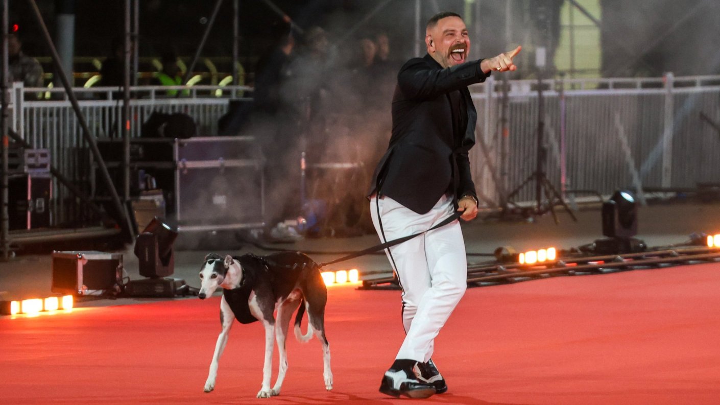 El animador abrió la alfombra roja en el Sporting Club de Viña del Mar y lo hizo en compañía de Ramoncito, un perro galgo que adoptó hace un tiempo.