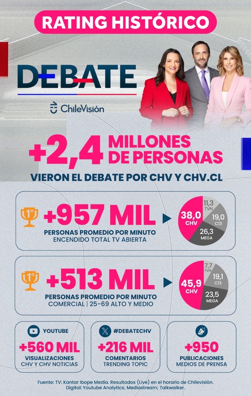 En plataformas digitales, la transmisión por YouTube (canal de CHV y CHV Noticias) generó más de 560 mil visualizaciones, mientras que en redes sociales se contabilizaron +216 mil comentarios con el hashtag #DebateCHV, que se mantuvo como Trending Topic durante toda la emisión.