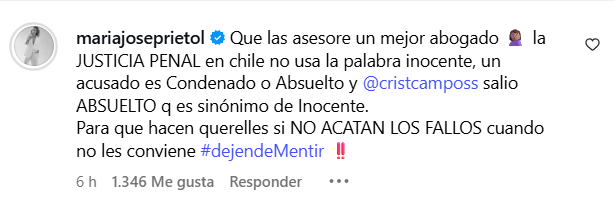 En ese contexto, Prieto comentó directamente la publicación de la entrevista: "Que las asesore un mejor abogado, la justicia penal en Chile no usa la palabra inocente, un acusado es condenado o absuelto y Cristián Campos salió absuelto, que es sinónimo de inocente”.