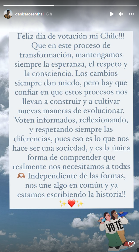 "Feliz día de votación mi Chile. Que en este proceso de transformación mantengamos siempre la esperanza, el respeto y la consciencia", escribió en una historia subida a su cuenta de Instagram.