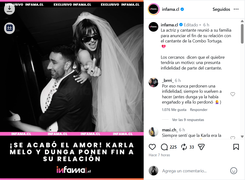 “La actriz y cantante reunió a su familia para anunciar el fin de su relación con el cantante de la Combo Tortuga“, anunciaron en Instagram.