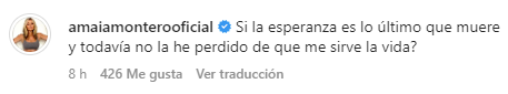 Posteriormente, en el segundo post de la misma foto, la cantante, quien anunció su retorno a la música a inicios de octubre, escribió en uno de los comentarios que "si la esperanza es lo último que muere y todavía no la he perdido, ¿de qué me sirve la vida?".