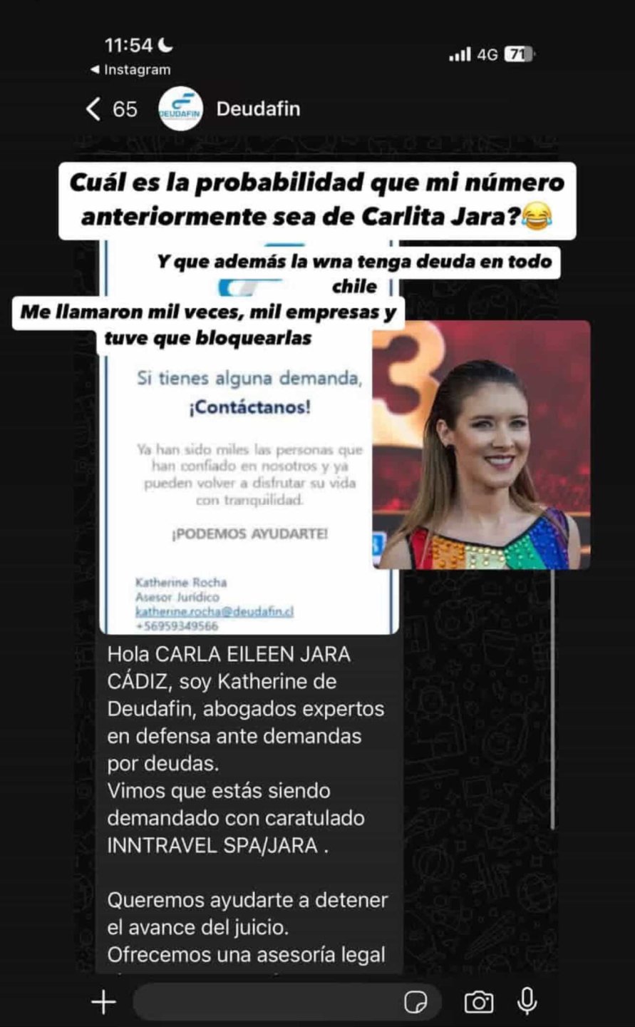 En la captura, se puede ver cómo la empresa Deudafin se intenta comunicar con el aparente ex número de la animadora con el siguiente mensaje: "Hola CARLA EILEEN JARA CÁDIZ... somos abogados expertos en defensa ante demandas por deudas. Vimos que estás siendo demandado con caratulado INNTRAVEL SPA/JARA".