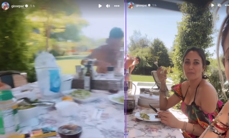 Mientras que el ex futbolista compartió registros en una piscina junto al hijo que tiene con Gisella Gallardo, la mujer publicó en sus historias de Instagram videos en un lugar parecido y en el que se ve a un hombre muy similar a "Pinigol", tatuajes incluidos.