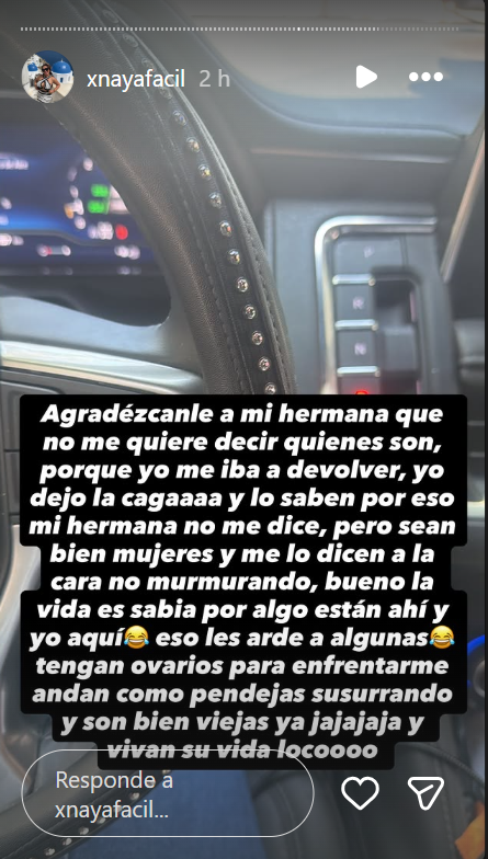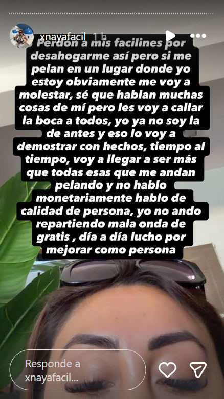 Dado que el conflicto escaló y su hermana no quiso que Naya volviera al recinto a discutir, Naya se sinceró: "Perdón a mis facilines por desahogarme así (...) voy a llegar a ser más que todas esas que me andan pelando y no hablo monetariamente, hablo de calidad de persona, yo no nado repartiendo mala onda gratis, lucho día a día por mejorar como persona", cerró.