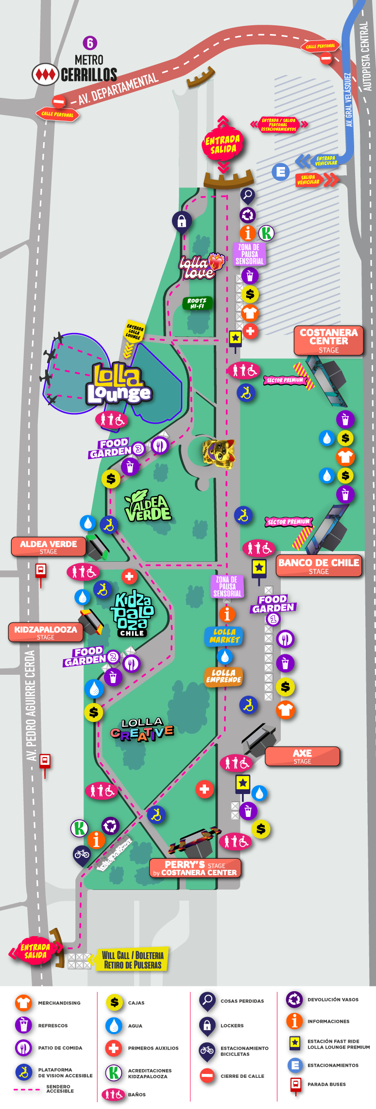 Son seis escenarios los que estarán dispuestos en el Parque Bicentenario de Cerrillos para esta nueva edición del festival musical. Pero además, en este mapa se especifica dónde se encuentran los puntos de hidratación, descanso y comida. Revísalo a continuación.