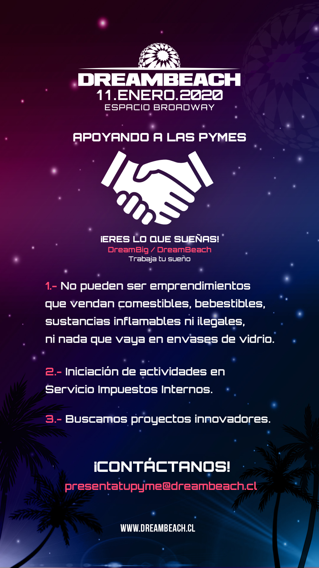 Dreambeach, el festival de electrónica más importante del verano que realizará el próximo 11 de enero del 2020 en Espacio Broadway, abrió hoy sus bases para postular a las pymes que quieran participar con un stand gratuito del festival. Podrán postularse todas aquellas pequeñas y medianas empresas (con iniciación de actividades) que ofrezcan productos y servicios fuera de la categoría de alimento, bebidas y productos inflamables o de vidrio.